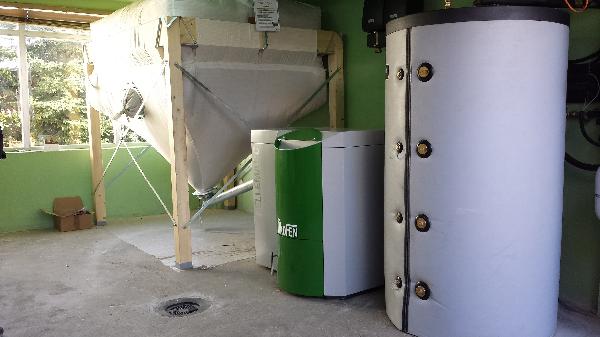 Instalación de una caldera de pellets pellematic de 20 kw sustituyendo a una caldera de gas natural en Burgos. La instalación consta de caldera de pellet Okofen 20kw con un acumulador combinado solar de 600 Litros.